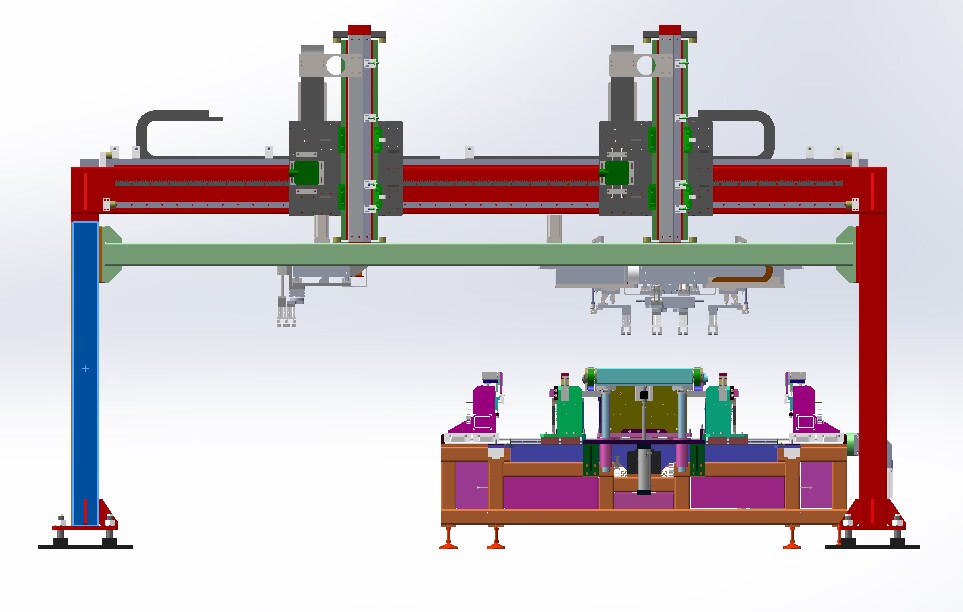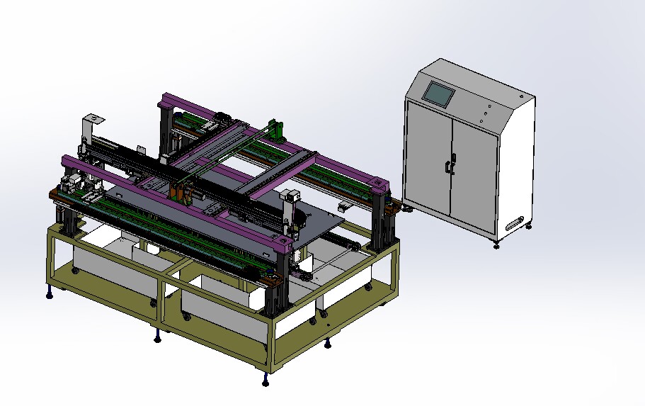 自動排版機的主要功能單元有:玻璃輸送定位系統(tǒng)、抓取行走系統(tǒng)、視覺檢測系統(tǒng)、電控系統(tǒng)等;通過以上功能單元,實現(xiàn)了將自動串焊機串焊好的電池串,按照工藝尺寸要求和排版方向順序自動排版鋪設(shè)到玻璃(EVA已經(jīng)鋪設(shè))上,組成電池串陣列。玻璃/EVA通過傳輸線傳輸至指定位置,機械手抓取電池串實現(xiàn)CCD定位、自動旋轉(zhuǎn)、自動排版功能。設(shè)備通過同步帶傳輸與自動生產(chǎn)線對接,實現(xiàn)了自動流水作業(yè)。